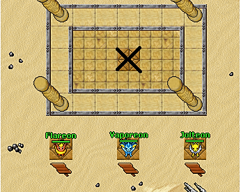 2° Passo: Siga o caminho ate o circulo vermelho utilizando "Fly". Os Players com Flareon, Jolteon e Vaporeon tem q colocá-los nos locais corretos como mostra a imagem a seguir.